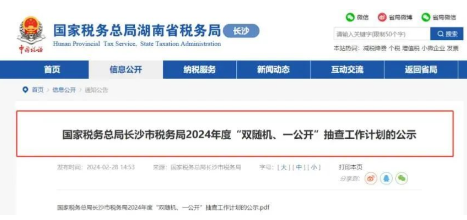 一、国家税务总局长沙市税务局近期公布了《2024年度“双随机、一公开”抽查工作计划》:计划在11月15日前采用定向与不定向相结合的方式进行抽查,年抽查比例约为20%。