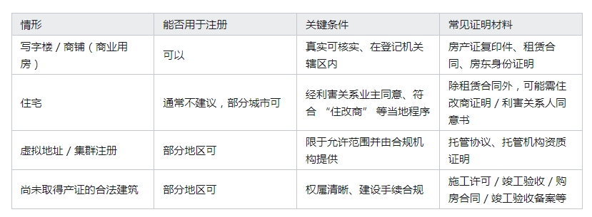 注册公司的地址需真实有效、在登记机关辖区内、并能提供合法使用证明;住宅一般不建议直接使用,确需使用通常要办理 “住改商” 并符合当地程序,不同城市口径差异较大。