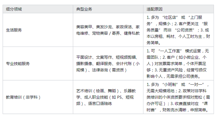 服务类行业通常无需大额固定资产,以 “个人技能 / 时间” 为核心产品,且客户多为个人或小微企业,对合作方的 “主体形式” 要求较低,完全匹配个体工商户的灵活性。