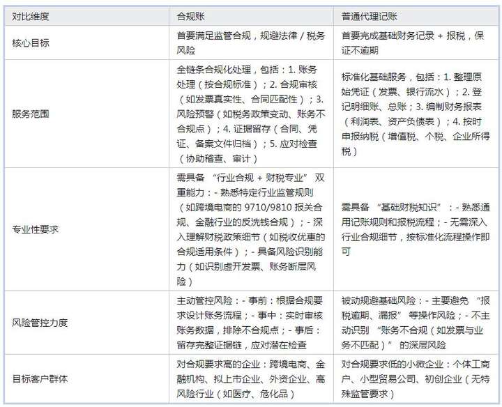 要理解 “合规账” 及其与普通代理记账的差异,首先需要明确两者的核心定位:合规账是以 “满足监管合规要求” 为首要目标的专业化账务处理模式,而普通代理记账更偏向 “基础财务记录与报税” 的标准化服务。两者在目标、范围、专业性等维度存在显著区别,具体可从以下方面详细拆解: