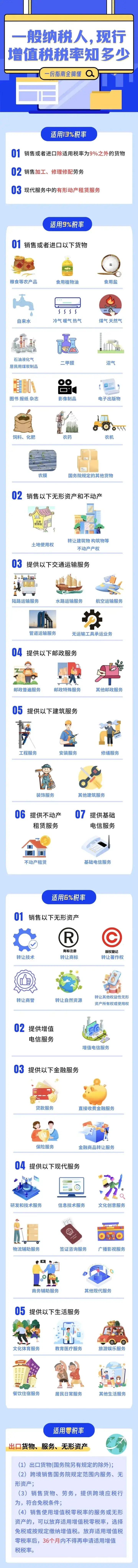 维持13%(销售货物、加工修理修配服务等)、9%(交通运输、建筑等)、6%(其他服务)三档基本税率,取消 “避孕药品和用具” 免税政策,其他免税范围不变。具体执行标准如下所示:
