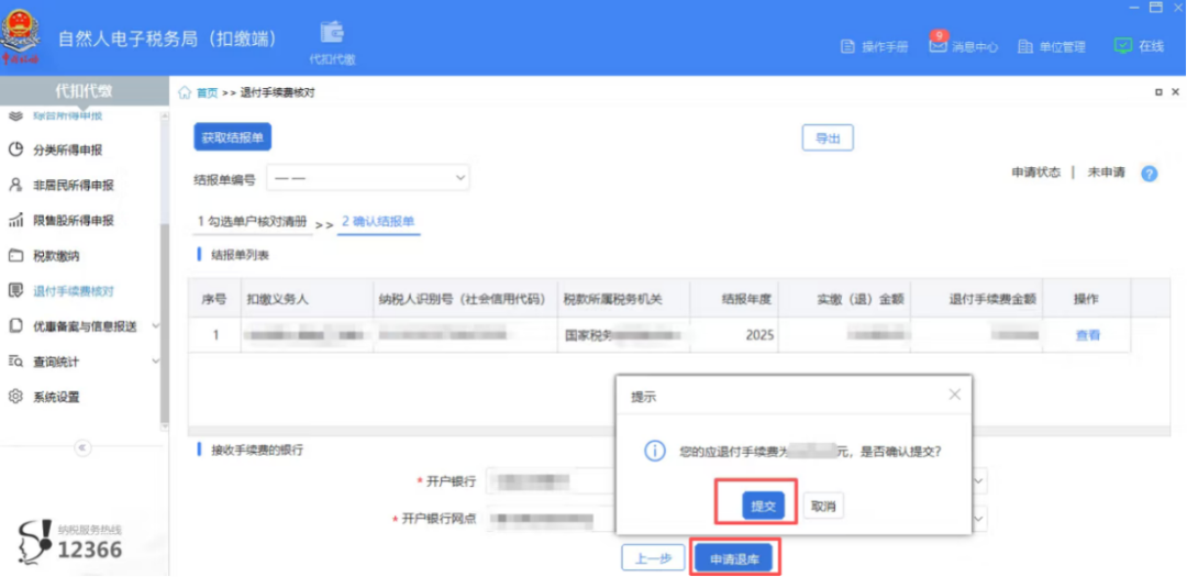 等待系统自动查询出退付手续费信息后,核对所属期、数据是否准确。核对清册无误后,可点击【下一步】确认结报单。