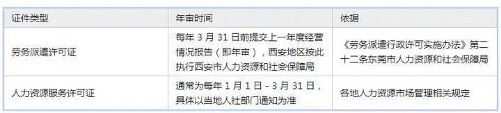 劳务派遣许可证和人力资源服务许可证年审核心信息如下,西安地区以当地人社部门通知为准,通常劳务派遣许可证年审在每年 3 月 31 日前,人力资源服务许可证年审多集中在 1-3 月。以下是详细内容: