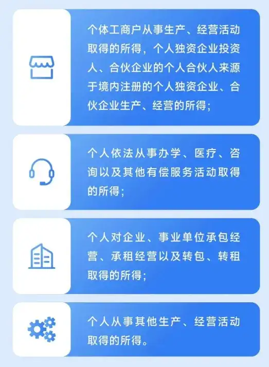 1、个体工商户从事生产、经营活动取得的所得,个人独资企业投资人、合伙企业的个人合伙人来源于境内注册的个人独资企业、合伙企业生产、经营的所得;