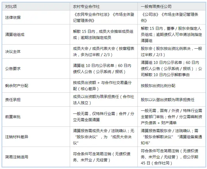 农村专业合作社注销按《农民专业合作社法》执行,供销社(多为集体 / 事业单位 / 社有企业)注销按对应主体类型 + 供销系统规定执行;二者与一般公司注销在清算主体、决议程序、公告要求、材料清单、责任承担上差异显著,且均需先清税、再清算、后注销登记。