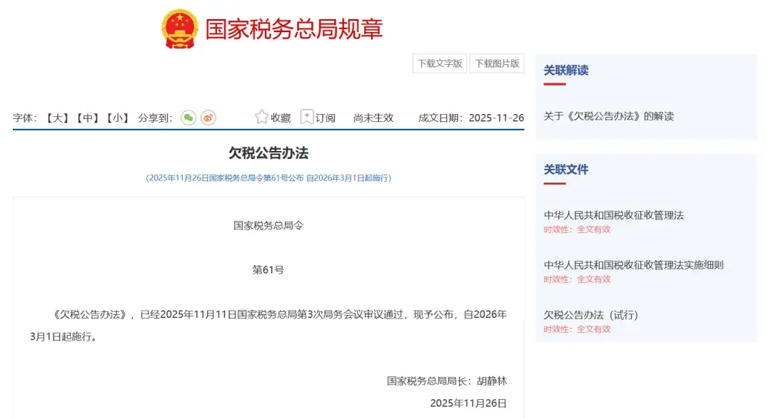 国家税务总局正式发布第61号令——《欠税公告办法》,将于2026年3月1日起正式实施!