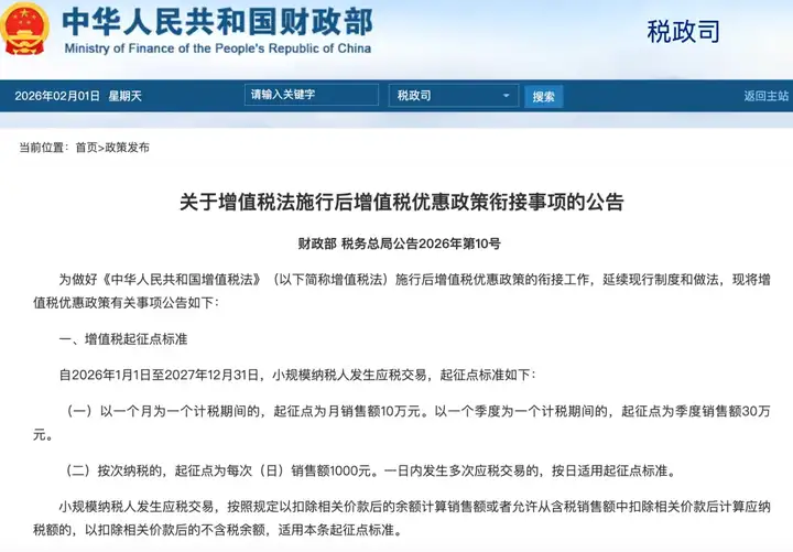 2026年1月1日起,增值税起征点正式调整,个税多项利好政策也延续至2027年,覆盖小规模、个体户、工薪族、住房交易人群等,实打实为市场主体和个人减负!