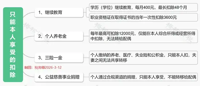 以下扣除为“个人专属”,只能本人享受,配偶无法转移扣除,千万别填错: