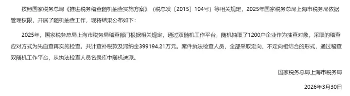 3月30日,国家税务总局上海市税务局公布了2025年度“双随机、一公开”抽查结果:随机抽取1200户企业,查补税款及滞纳金合计39.92亿元,平均每户补税约330万元。